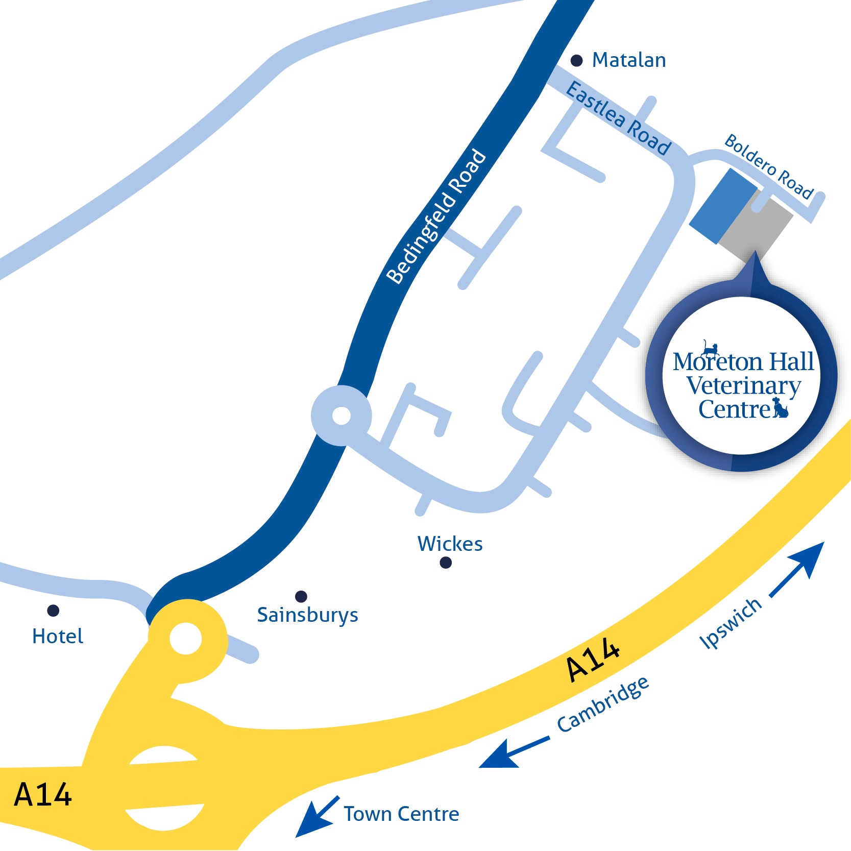 Moreton Hall Veterinary Centre is located on Boldero Road and is adjacent to Easlea Road. Our main entrance to the car park is easily accessible and easy to find.